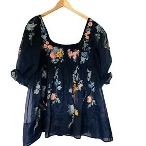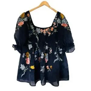 ASOS Floral Embroidered Tulle Puff Sleeve Babydoll Dress Size 14 Navy Multi
