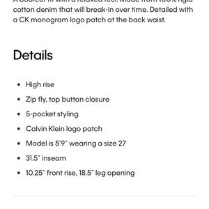 A bootcut fit with a relaxed feel. Made from 100% rigid cotton denim that will break-in over time. Detailed with a CK monogram logo patch at the back waist.