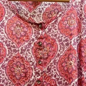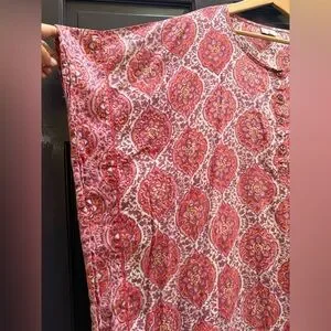 Pretty Anokhi block print caftan, great as a beach coverup. Purple, pink, orange white print with contrast fabric details on sides and hem. Super simple square design measures 38" inches across at widest but it stitched at 25" across near the mid section. Length 40".
