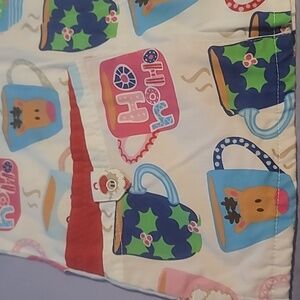 Soft fabric with a blend of pastel color holiday mugs. Four snap closure front pockets with red accent. Comfortable and stylish.