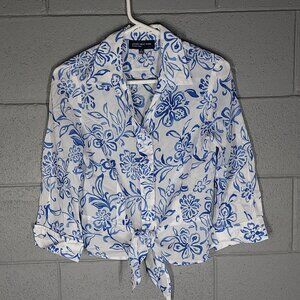 Jones New York Signature Blue & white floral lightweight top. Very blousy. Front hem tie and button cuffed 3/4 length sleeves. Hidden front button closure. 100% cotton. Size small. Excellent condition.