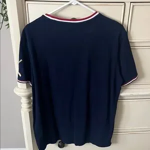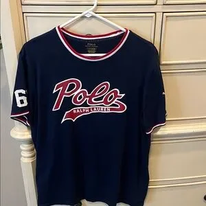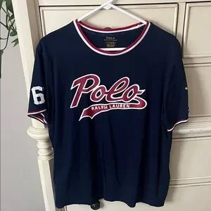 Stylish navy blue t-shirt with red and white accents. Features Polo logo and number detail.