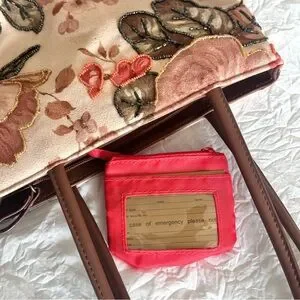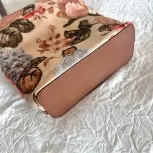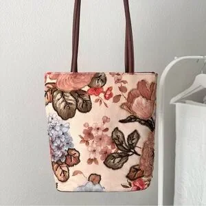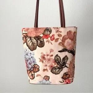 Elegant vintage floral beaded tote bag with long shoulder straps. Inside has three different compartments and a zipper closure. Brand new inside. Also has an emergency card case attached. Exterior has a very soft velvet suede like material. Overall, a gorgeous bag to add to your collection!