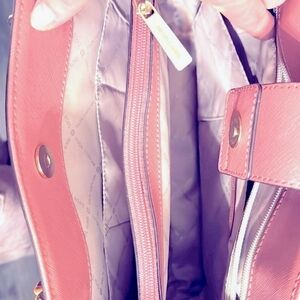 Stylish pink tote bag perfect for any occasion. Features a sleek design with durable handles. Ideal for adding a pop of color to your outfit. Please review pictures. Does have a little wear on top of handles otherwise excellent condition.