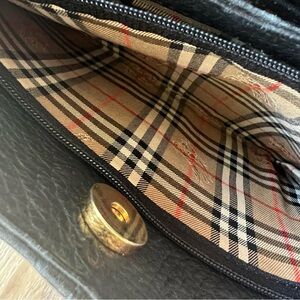 Classic black leather Burberry shoulder bag offering comfort style and practicality. Nova Check Shadow Horse interior with multiple pockets and snap closure. Over all beautiful condition. No corner rubs and clean interior, no stains or notable markings inside or out other than slight wear on straps and light hairline scratches on hardware. Outside leather and inside are in excellent condition. Please bid responsibly, refer to photos and ask questions if you have any, all sales binding!
