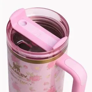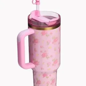 Charming pink STANLEY with floral pattern. special collab! Loveshackfancy Features a durable handle and secure lid.