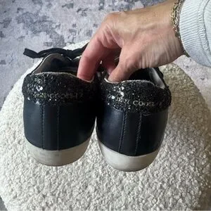 Stylish sparkle black sneakers with lace-up design. Comfortable and trendy.
