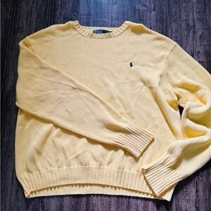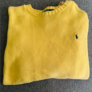 Bright yellow crewneck sweater by Polo Ralph Lauren. Features classic logo embroidery. Ideal for casual wear.