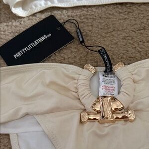 Elegant cream bikini with striking gold detail. Ideal for beach outings.