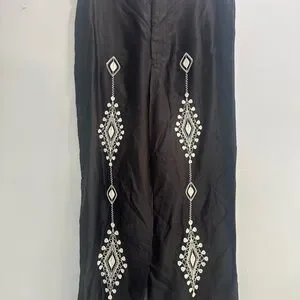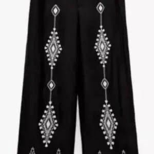 Chic wide leg pants with intricate white embroidery. Perfect for a stylish look.
