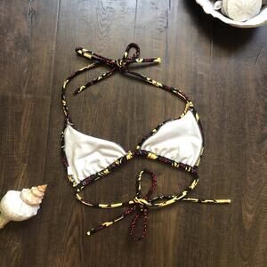 Vintage Hawaiian Tropical Red Orange Yellow Retro Bikini Tie Top Small. Stunning vibrant colors! No label but the size tag appears to be a heavy duty vintage cotton tag. Unlined, no cups and no inserts available. Excellent vintage condition. Could fit an a cup b cup small c cup small d cup depending on desired fit.
