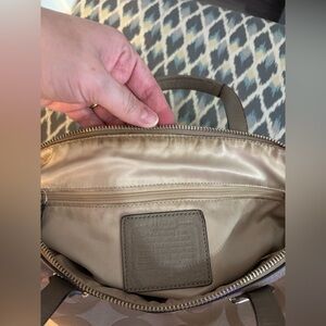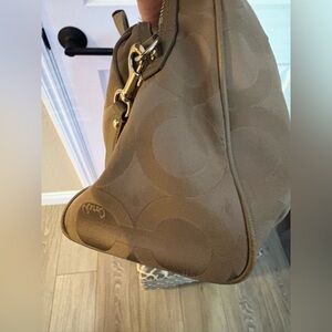 EUC Stylish Coach satchel in a medium tan color. Features the signature C pattern in a jacquard fabric with leather trim. Has a crossbody strap and 2 handles. Interior has one zipper pocket with 2 slip pockets. No exterior pockets. Has a zip top closure.
