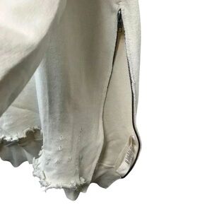 Oversized silhouette with intentional distressing-holes and frayed hem.