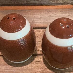 Brand New! Football Salt & Pepper Shaker Set. Ceramic, hand painted footballs for your salt & pepper. Hand wash only. So fun for your football display, charcuterie board or snack table.
