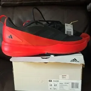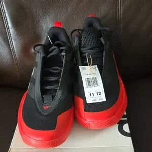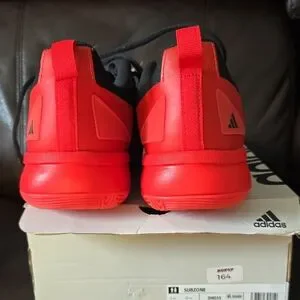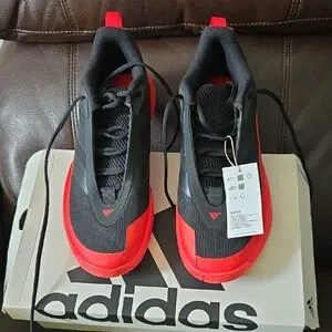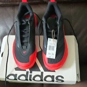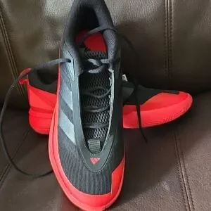 Bold Adidas sneakers in black and red (appears to look a little orange in my opinion). Sleek design for style and comfort.
