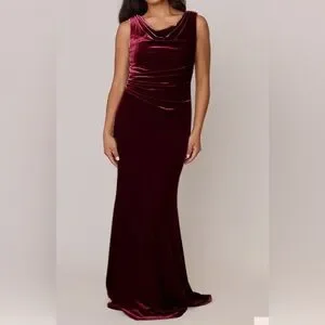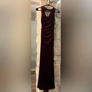 Step into elegance with this stunning burgundy velvet evening gown. Perfect for any formal occasion, this dress offers a luxurious feel and a flattering fit.