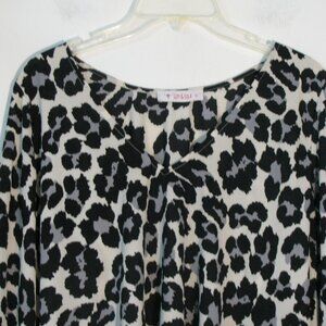 Izzy & Lola blouse in size large. Cute animal print in white, black and gray. Puff sleeves, very unusual. Tried to show in last photo but did not show very well. Lightweight and silky with a v neckline. Made from 100% polyester, hand wash recommended.