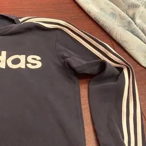 Navy joggers with classic white stripes. Comfortable fit. Perfect for active older boy. A favorite sweatsuit with some discoloration and minor holes from use but plenty of life still left.