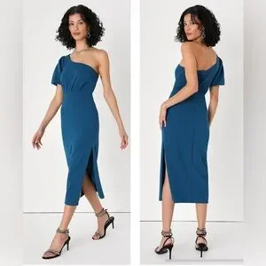 New Lulu's Ultimate Poise Teal Blue One-Shoulder Midi Dress XS X-Small Classy