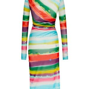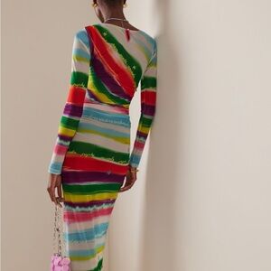 Vibrant maxi dress with multicolor stripes. Long sleeves and elegant design. Perfect for any occasion.