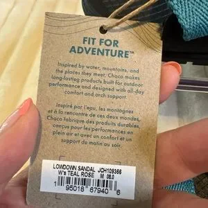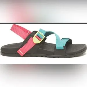 Stylish Chaco sandals with teal straps. Durable black sole. Ideal for everyday adventures.