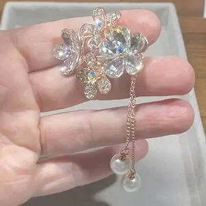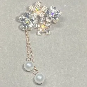 Add a touch of elegance and radiance with this floral-inspired brooch. Featuring dazzling crystal-paved blossoms arranged in a graceful cluster, it shimmers with every movement. Two delicate gold-tone chains accented with lustrous pearl drops create a soft, romantic finish. Perfect for elevating jackets, dresses, scarves, or bags with timeless glamour.