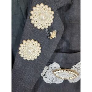 Preowned in good condition with no rips, tears or stains; this was originally a mens suit jacket. It was altered and decorated with brooches, doilies, ribbons etc to create a women's jacket; It is vintage. They were popular back in the late 80's to 90's;