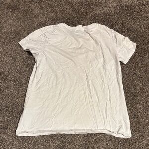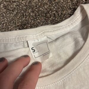 SOLD VIA MERCARI // White t-shirt with bold red and blue 'Rebel' graphic.