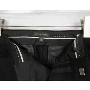 Classic and tailored, these Banana Republic Sloan Slim Fit pants are a wardrobe essential. Designed in a sleek black with a mid-rise and flattering slim-leg silhouette, they feature faux welt pockets at the back, functional front pockets, and a hook-and-bar closure for a clean, polished look. Made from a comfortable, stretchy blend of rayon, cotton, and spandex for flexible wear throughout your day.