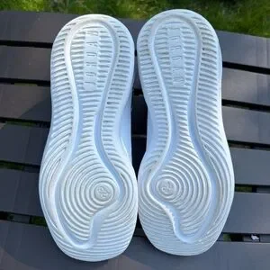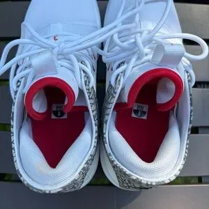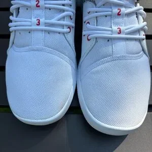 Shoes in excellent condition. Worn a couple of times. Some scuffs and marks on the white upper and midsole, discoloration on the top of the left heel and toes, minor wear on the soles, and some creasing on the toe box (please see pictures for details).