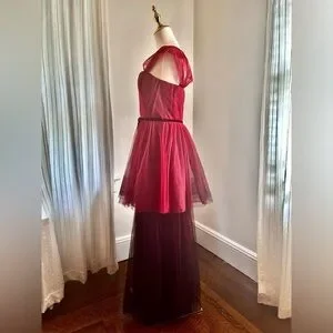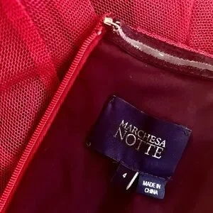 A chic layered red mesh gown by Marchesa Notte. This dress has been used a few times and has a little bit of damage in the back near the waist. Otherwise, this dress is in good condition.