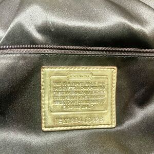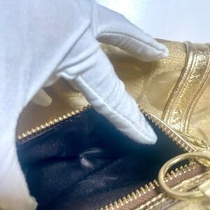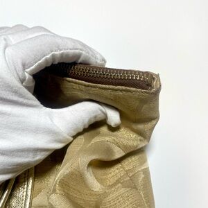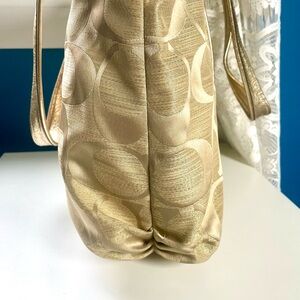 This Coach Poppy Gold Signature Tote Bag is a stylish and spacious bag, likely made from a metallic jacquard fabric with leather trim and gold-tone hardware. It features a secure zip-top closure, an exterior zip pocket, and a roomy interior with at least one zip pocket and two slip pockets. It is distinguished by its two original hangtags and is well-suited for casual outings, travel, or daily use.