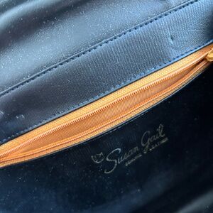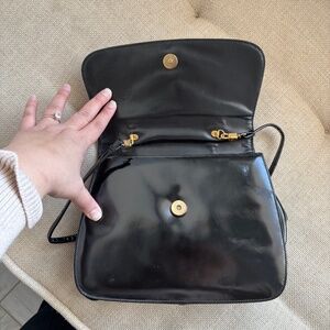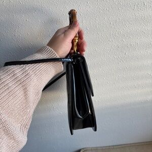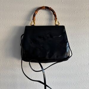 The purse is a rare style by Susan Gail that is very similar to vintage styles by Gucci! It is a two-way style, medium size, black patent leather purse with gold hardware and a bamboo handle. It is a classic top handle, mod 'Kelly' style, similar to early Jackie O styles by Gucci. There is an exterior pocket at the back and it will come with a removable gold chain strap! It has the the perfect look and colors that will go with everything!