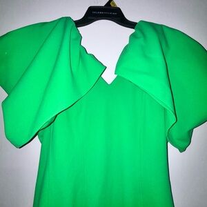 Bold green dress with unique asymmetrical design. Perfect for making a statement.