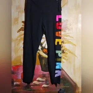 Chic black leggings with bold rainbow 'LOVE PINK' lettering. Ideal for a vibrant casual look.