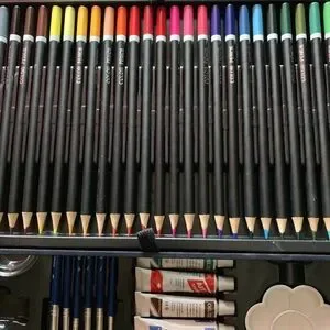 Comprehensive art set featuring colored pencils, paints, and brushes. Ideal for artists.