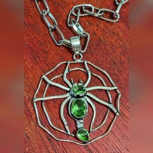 Bring a touch of nature's mystique to your style with this stunning spider web necklace, featuring lab-created Peridot stones. The intricate spider pendant is crafted from high-quality silver filled with 925 stamp, offering the look & feel of sterling at a more accessible price. With proper care, this piece is made to last. The pendant hangs from a durable 30" stainless steel paper clip chain. For a closer look at the exact measurements, please see photos.
