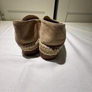 Stylish tan suede slip-ons with woven accents. Perfect for everyday comfort.