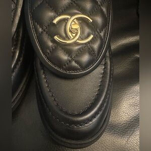 Elevate your style with these Chanel black loafers, featuring a luxurious gold accent. Perfect for any occasion, these shoes offer both comfort and elegance.