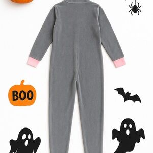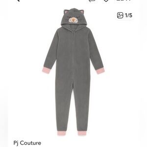 Cozy up in this adorable gray fleece pajama suit by PJ Couture, size Medium. Features include a hood with embroidered cat face, 3D ears, heart-shaped yellow nose, and pink-trimmed cuffs at wrists and ankles. Super soft and perfect for lounging, gifting, or Halloween fun.