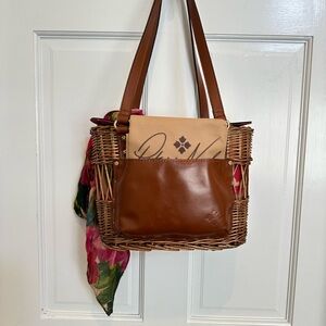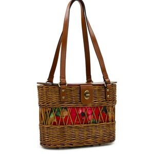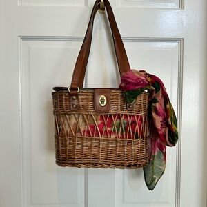 Add a chic touch to your wardrobe with this new with tags Patricia Nash Kalamaria satchel, complete with its original floral scarf detail and dust bag. Handcrafted with woven rattan and genuine leather trim, this satchel is the perfect blend of timeless design and effortless style.
