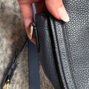 Gently used. Excellent condition. Small blemish on the backside of the bag (last picture). Comes with adjustable two toned strap.