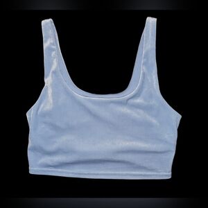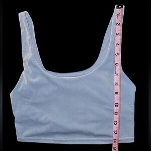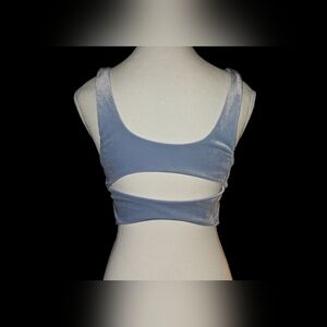 This is an Athleta Women's Velvet Cut Out Crop Top in size Small. It features a sleeveless design with a scoop neck and a pullover closure. The top is blue in color and made of polyester, nylon, and spandex blend fabric. It is designed for activewear use, with stretch and breathable properties suitable for activities like gym training, walking, and yoga.