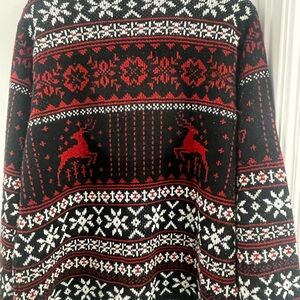 Charming cardigan with festive patterns. Features reindeer and snowflake designs. Ideal for cozy gatherings.