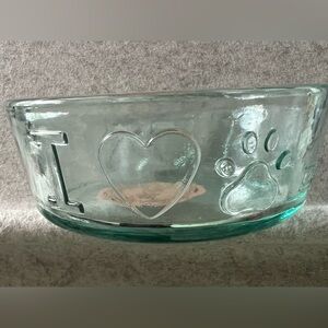 Clear glass pet bowl featuring a heart design. Perfect for pet lovers.