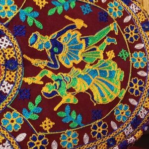 Intricate embroidery with traditional motifs and figures.