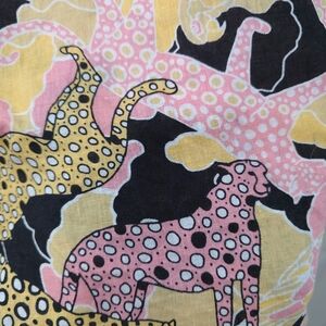 Vibrant button-up collared shirt with a playful animal print. Features pink, yellow, and black colors. 100% soft linen. Perfect for summer outings or vacations. Statement piece.