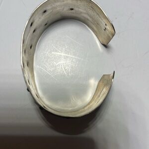 Bought from Artful Home this handmade silver cuff was fabricated by the artist Dennis Higgins. Higgins utilized repousse as a technique for this bracelet. The beauty of this piece is how it will turn black as it continues to oxidize and the scattered bumps will remain silver from wear. Dimensions are: 1.25” wide, 2.5” high. Bendable to any wrist. Comes with protective bag. Never worn.
