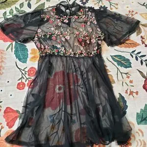 Black Mesh Babydoll Dress w/Floral Embroidery 1x Garden Party/Whimsygoth