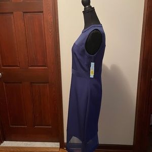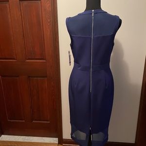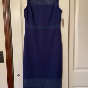 ANTONIO MELANI blue form fitting midi-dress. Never worn. Upper body and lower hem is mesh. Upper body is lined. Lower skirt is lined to the mesh. Back zipper that allows for easy on and off. No need to pull over your head when your are getting ready for a night out on the town!
